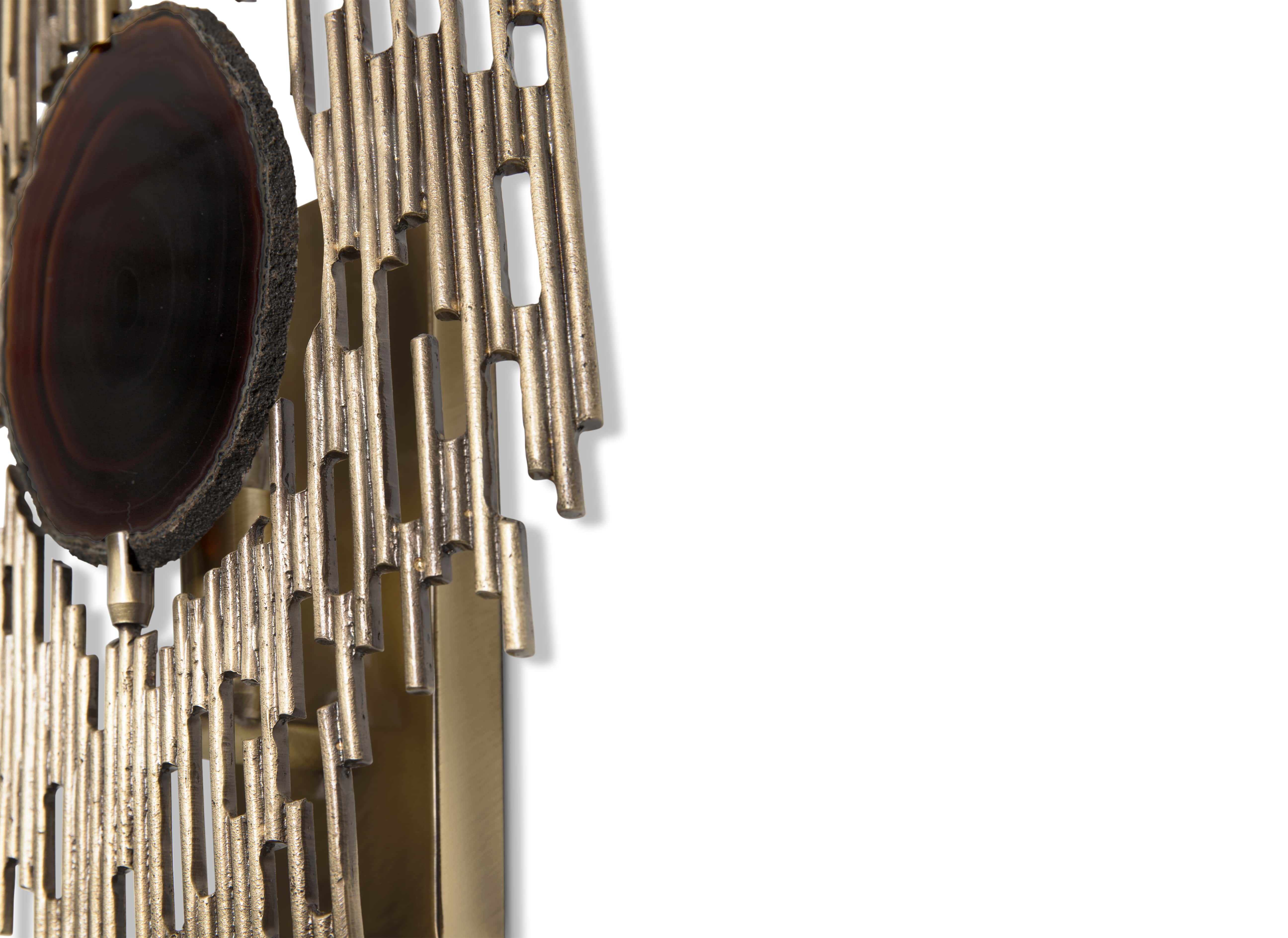 The Vivre offers exquisite vintage details with a decidedly modern profile. The dark neutral tones and the exquisite patterns in the agate stone are uniquely captivating against the light and the gold metal which embraces the stone in perfect harmony and balance. A hand-selected agate slice offers the perfect glow when the light pours through.