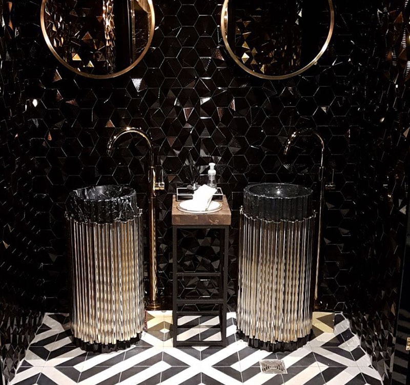 This stunning bathroom’s restaurant of the Canadian rapper Drake called Pick 6ix was designed by Kroeze Interieur, and it feature Maison Valentina Symphony freestanding. The Symphony freestanding was inspired by a vision to understand the past and interpret it through cutting-edge technology and contemporary design, we have created this emotional freestand passionately inspired by music. Handcrafted with the finest materials, this breathtaking piece is of genuine style, ensuring mystery and elegance. The golden gives a luxury touch to every bathroom.