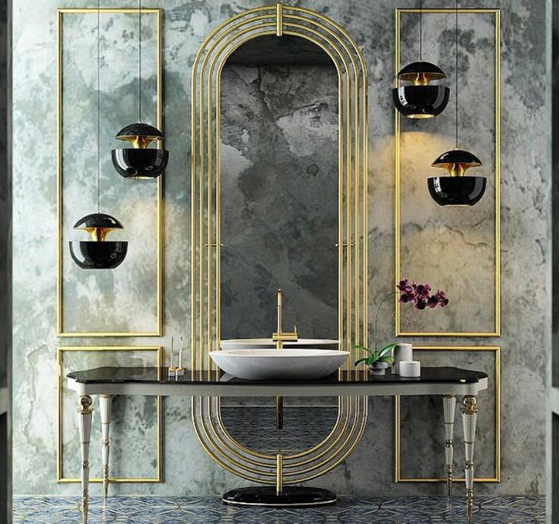 A project designed by Paris Davidovsky for Idea Home Kiev. Grey marble surroundings with golden details, a stunning and elegant combination where our Colosseum Floor Mirror clearly stands out for its luxurious design! Made in Nero Marquina Marble and Polished Brass, the Colosseum Floor Mirror is always a safe yet sumptuous bet!