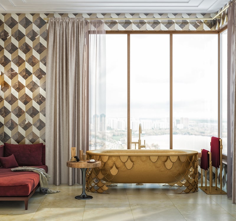 Located in Russia, Tochka-design created this stunning design, the patterned marbled wall works beautifully with the golden accents of our own Koi Bathtub. An amazing balancing act between modern and mid-century!