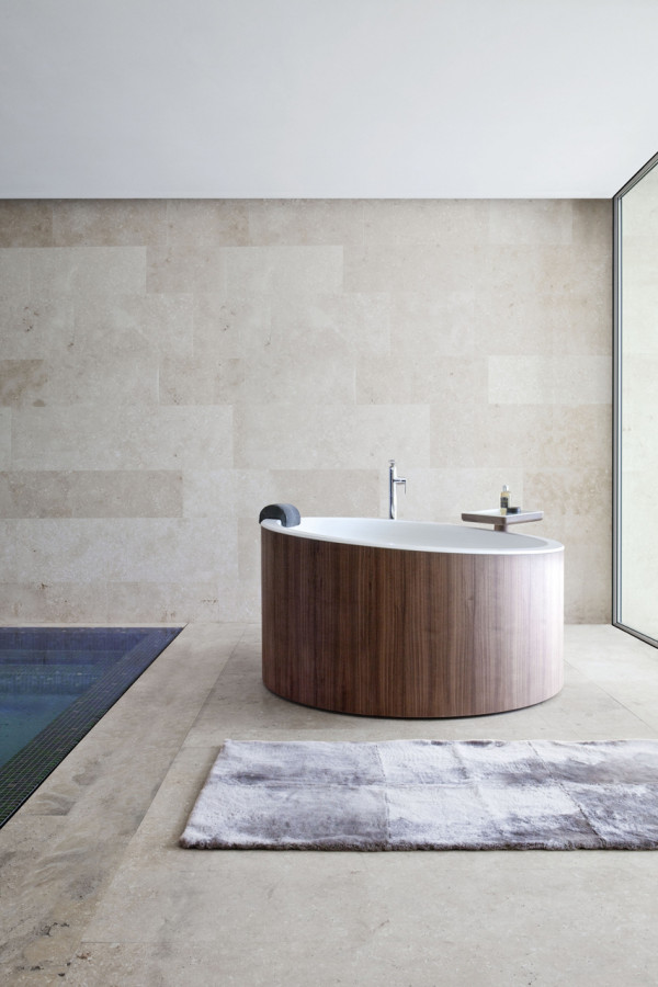 The matching bathtub is made of the same materials and is finished in solid wood on the exterior. The freestanding, round tub is angular cut along its entire section letting you know where to get in. The taller part makes a perfect place to lean back and relax.