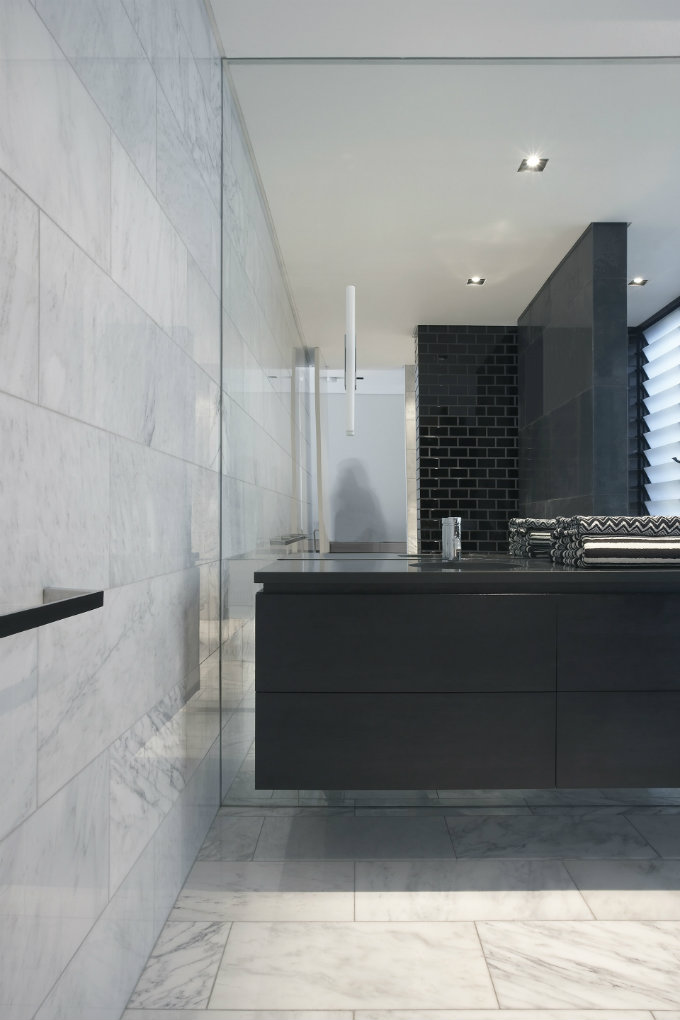 This luxury bathroom has a note of marble in the floor and wall. That elegant choice of tile is highlighted by the floor to ceiling mirror, with a discreet wall lamp and the black floating wash basin.