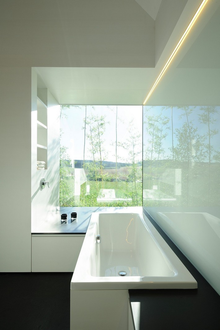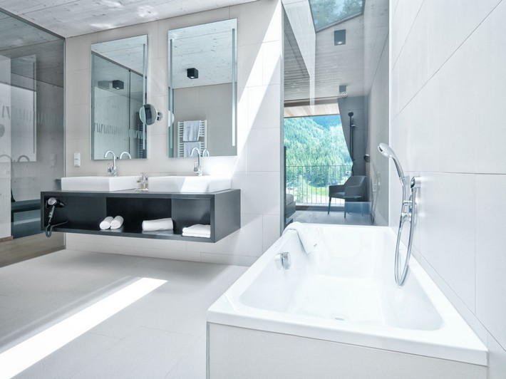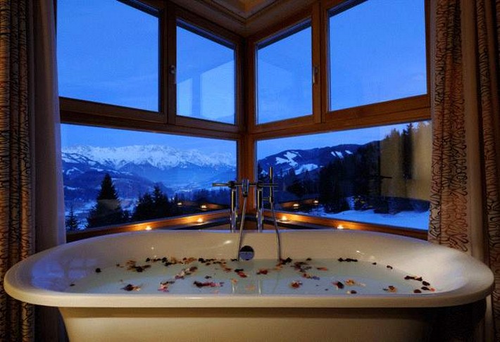 With an 180 degree view of the surrounding mountains, the bathtub in the suite of Forsthofalm in Austria offers a very special bath experience. With herbs and flowers from the region as bath supplements, one can give oneself fully to nature and its powers.