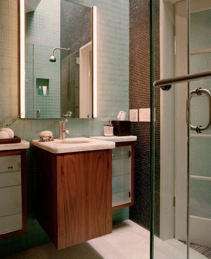 The contrast between dark and light colors adds elegance and sophistication to this John Lum Architecture bathroom. Is a fortunate meeting of brown and green in square shaped tiles. The entire bathroom is a statement of modern and comfortable design  bathrooms.