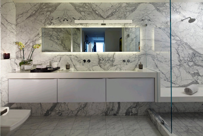 Studio Becker presents a marble bathroom in straight lines. Black and white walls opened bay a mirror that is illuminated by direct and indirect light. The shower complete e this harmonious bathroom furniture set.