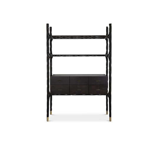 Reading is fundamental, and so we start by showing the Lanka Bookcase. This bookcase is inspired in a traditional method practiced in Sri Lanka, the stilt fishing, now disappearing. The vertical poles embedded into the seafloor are the main reference for the structure of Lanka: in matte black lacquer, it supports the main body covered in matte wood veneer, and with matte brass details. This bookshelf is an elegant choice for any room in a residential or hotel project.