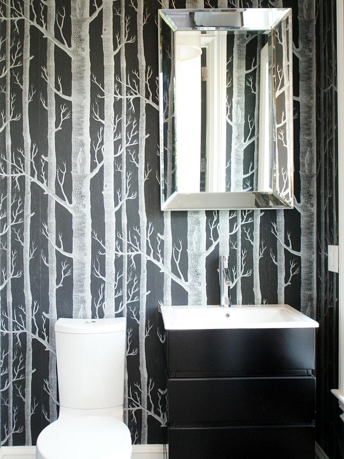 Small bathrooms are a great place to try striking Black and white bathrooms wallpaper. Designer Melissa Miranda chose ceiling-reaching “Woods” wallpaper from Cole & Sons to emphasize the height of the room.