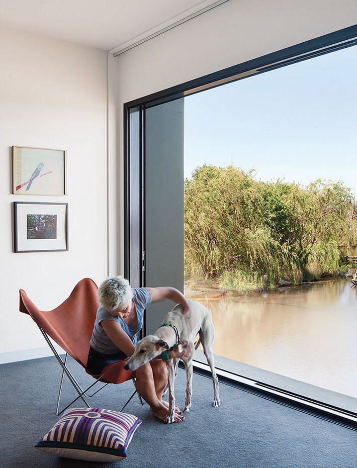 With a large glass door from Capral that opens completely to the elements, the master bedroom at thislakeside Australian retreat becomes part of the landscape.