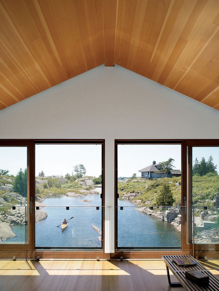 At this buoyant summer home on Lake Huron, that is nestled between USA and Canada, living room windows overlooking the water let the residents feel as though they’re playing in the water even when they are dry and warm inside.
