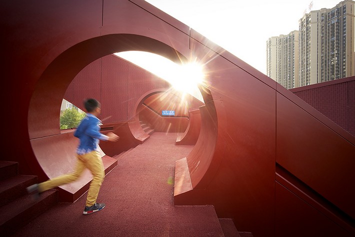 NEXT architects has completed an undulating red pedestrian bridge in the chinese city of Changsha that offers multiple paths across the dragon king harbour river. NEXT — who has previously designed a ‘bat bridge’ in the netherlands — titled the steel structure ‘the lucky knot’, referencing its ribbon-like form. Measuring 185 meters in length and 24 meters in height, the bridge offers sweeping views of the river, the adjacent meixi lake, and the city itself.