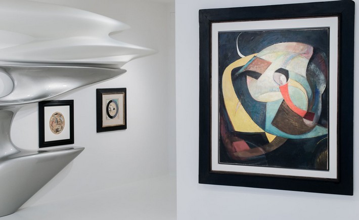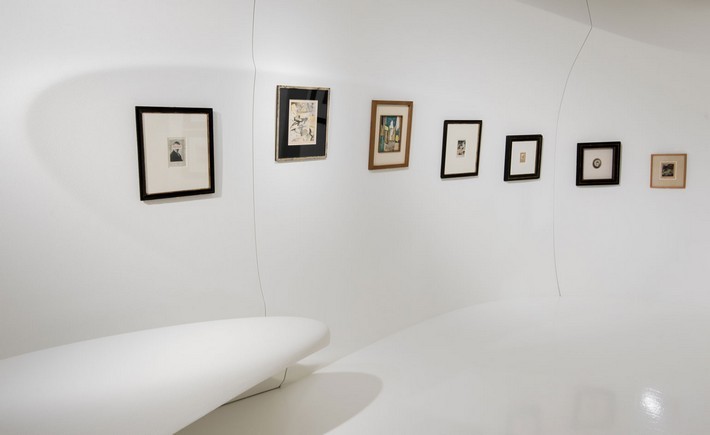 Now, in the resultant show on until 30 September, some 70 paintings, sculptures, collages and ephemera by Schwitters are set among a remodelled interior designed to ‘receive them.’ Also here are designs from the Hadid archive; a ‘Vortexx Chandelier’ hangs inside the entrance, ‘Dune Formation’ shelving cuts along the walls, ‘Nekton’ stools are scattered around and a ‘Genesy Lamp’ mirrors the curve of a wall. It’s a triple tribute; to Schwitters, to Hadid and to Dada in its 100th year.