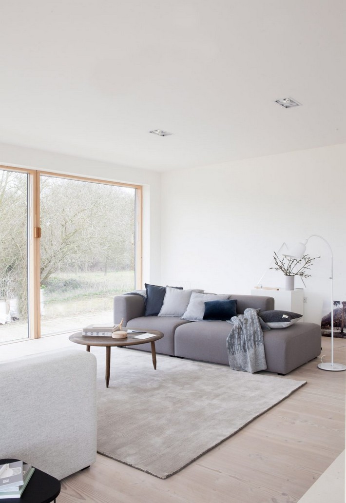 Panoramic glazing frames views of meadows and cornfields from this farmhouse designed by Danish studio for Norm Architects for a working farm in southern England.