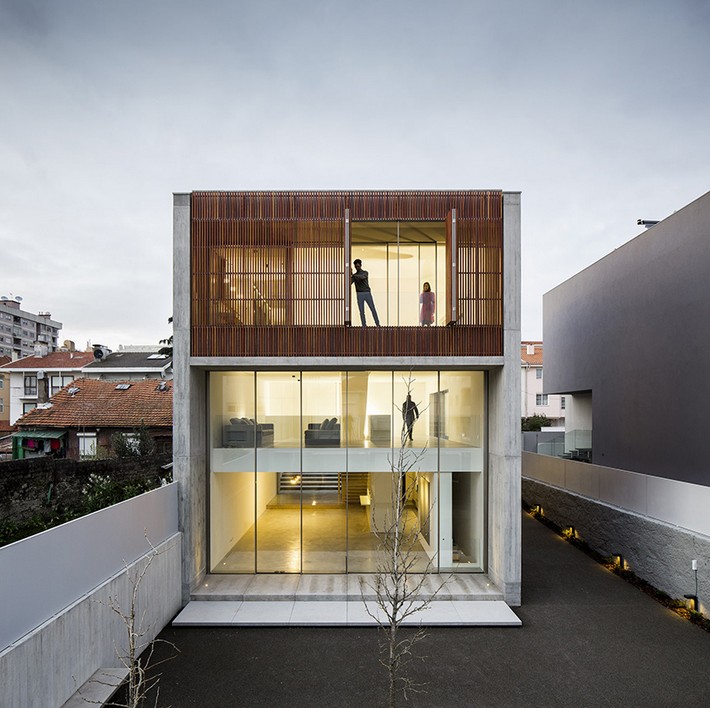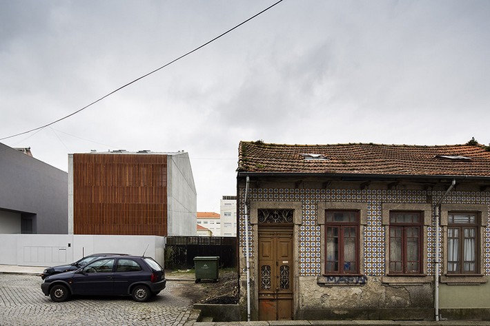 Design by Mário Sequeira’s architecture studio AZO, the main façade is clad with timber slats whose coloring is derived from that of the surrounding urban fabric. These slats form a dynamic elevation, where individual elements can be opened or closed at the occupants discretion. This method also helps control natural daylight and ventilation throughout the home. The rear façade is more open, with double-height glazing spanning the lower two levels.