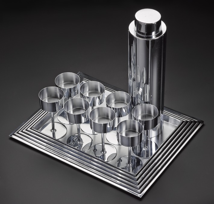 Around 1935, Norman Bel Geddes crafted this sleek cocktail tray made of chromium-plated copper alloy.