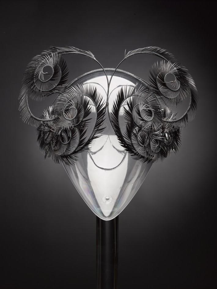 A black goose-feather mask crafted by Irene Bussemaker for couturière Iris van Herpen’s Synesthesia collection in 2010.