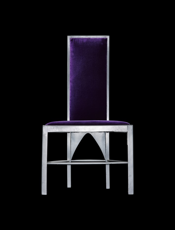 A velvet-upholstered tearoom chair designed by Charles Rennie Mackintosh in the early 20th century.