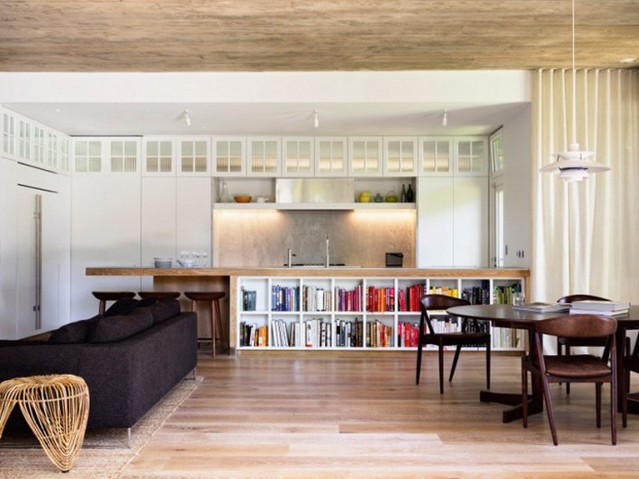 Accompanied by series of white and elegant details, the Arcadia house is seem to be the perfect place for family living. All the windows are complimented with a continuous series of white, detailed shutters and monolithic concrete wall below. The rooms are minimalistic with bright and contemporary style details. A concrete ceilings, recycled hardwood timber and oak staircase unite everything into the whole consistent unity, which easily can be called a perfect summer residence.