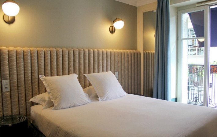 Fabric headboards and colorful geometric tiled floors are becoming Meilichzon’s visual signature and manifest at Hotel Bachaumont. There, minimalist furniture pieces—beautiful marble side tables to skinny legged chairs—all help add more space to the Parisian-sized rooms. For those wanting to celebrate something special, the four different suites offer a fantastic view of the city.