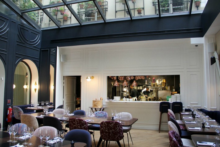 The concept for the restaurant is a new take on the French brasserie—one fit for the 21st century. The heart of Restaurant Bachaumont is unusually enclosed with a glass roof, distinguishing itself from the typically dark, cramped restaurants in Paris. The open kitchen (decorated with beautiful copper kitchenware), spacious tables and tall lit candles set the tone for an elegant night, with contemporary design touches like bright fabric print chairs and tilted mirrors to match.