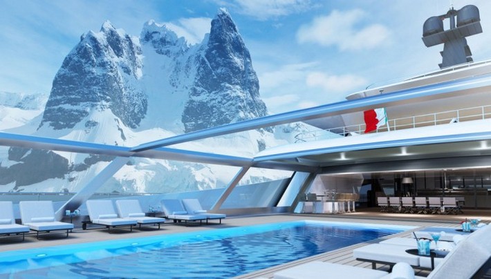 The 308-foot Purity from Azure Naval Architects ups the ante on space and speed with the ability to reach 21 knots and a cruising range of 5,500 nautical miles. Inside, guests have access to a beach club, a wellness area, and a gym. In the off chance even more space is needed, the pool floor aft can be raised to create extra space or for use as a helipad. (azure-na.com)