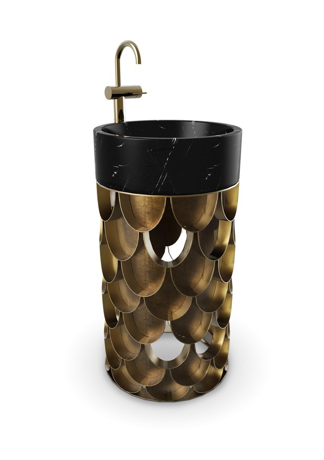 Together with our partner BRABBU, we will be presenting at Stand 1247 (L1) the KOI Bathroom Collection which includes a double washbasin and a freestand made of brushed aged brass and polished nero marquina marble.