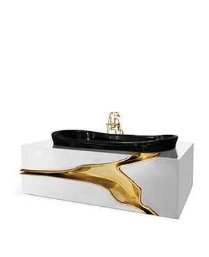 Structure: Wood, High gloss black lacquered, Coated with a sheet of stainless steel; Tear: Polished brass; Inside: High gloss black lacquered; Sink: Casted Polished Brass