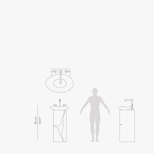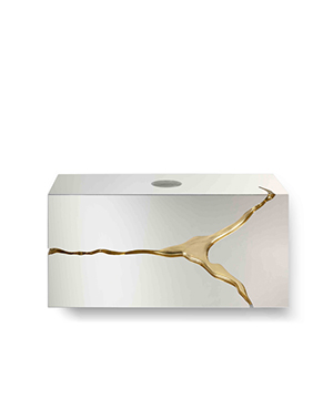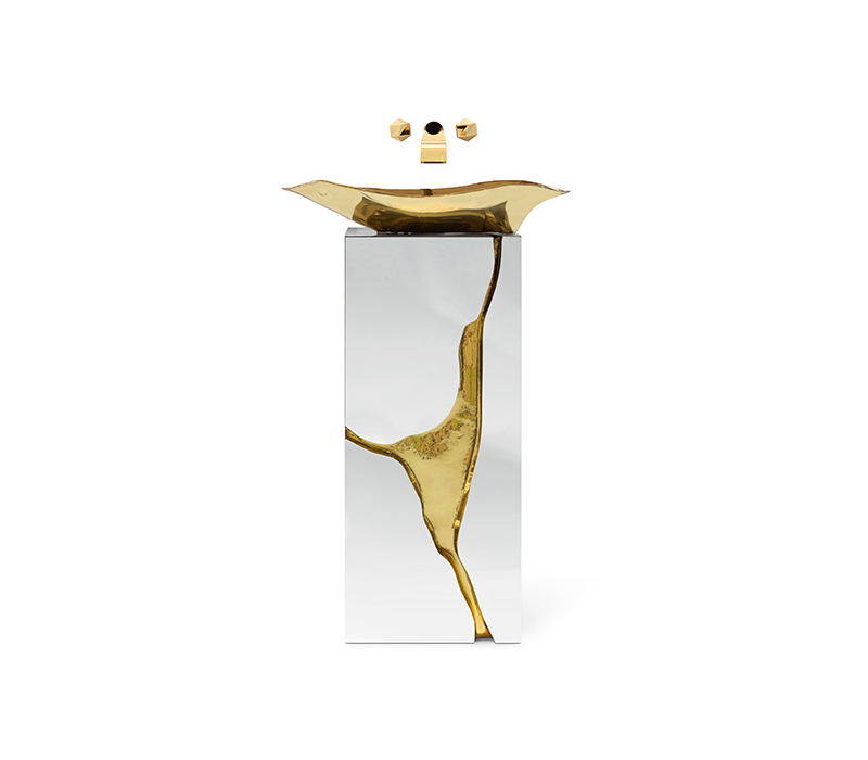 Lapiaz is a square pedestal sink inspired by natural stone cracks. This is the reason it features an incredible fissure handcrafted in polished brass, producing an organic finish. The wooden structure is coated in stainless steel, giving it a reflective luxurious effect. Rich and glamorous, this freestanding will completely change your bathroom set.