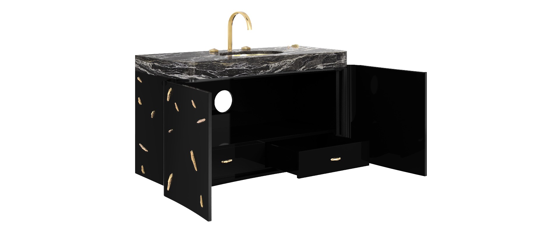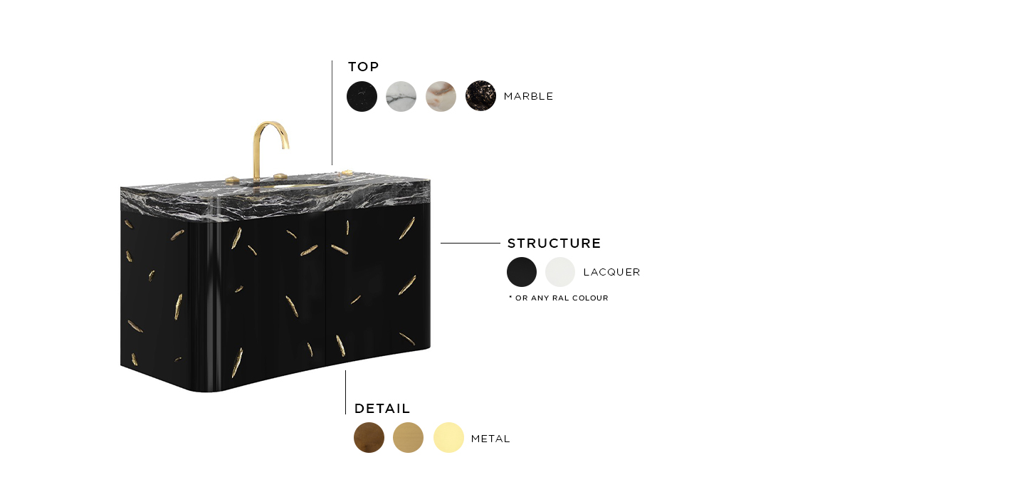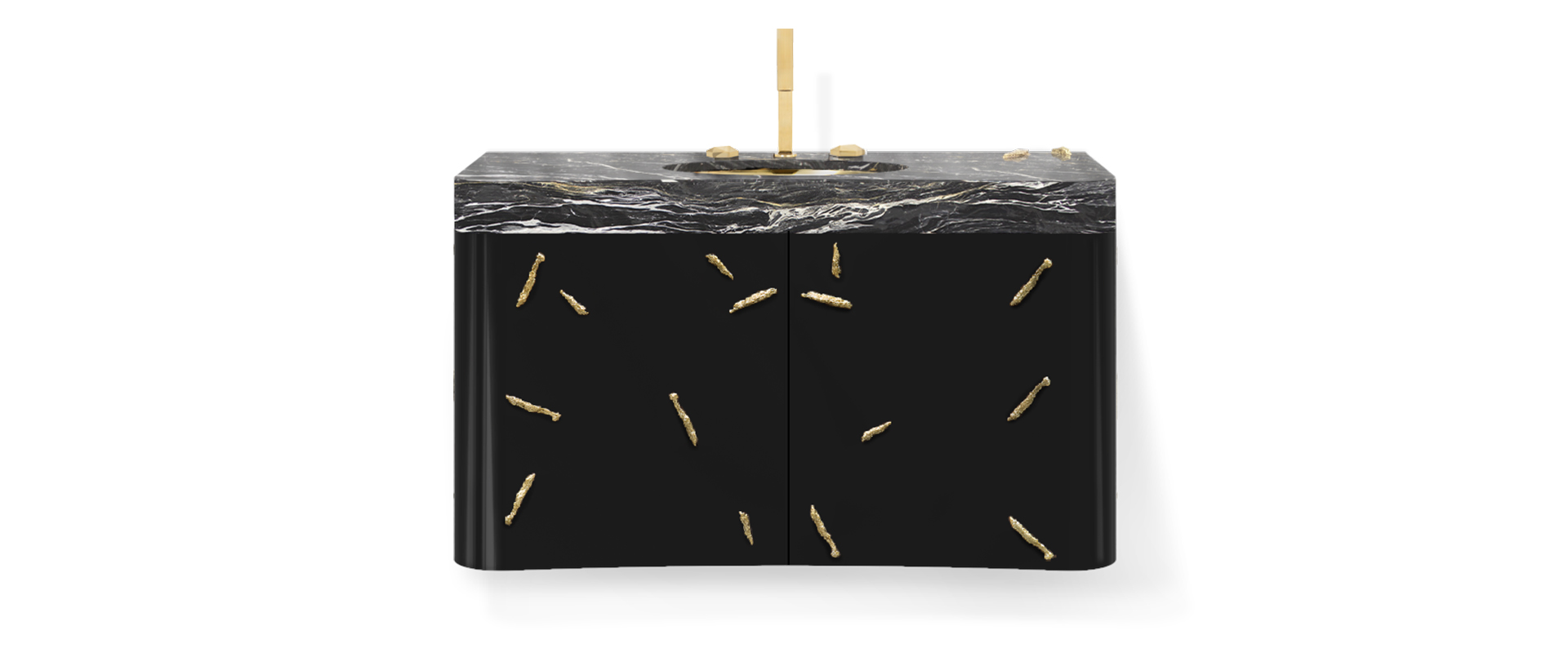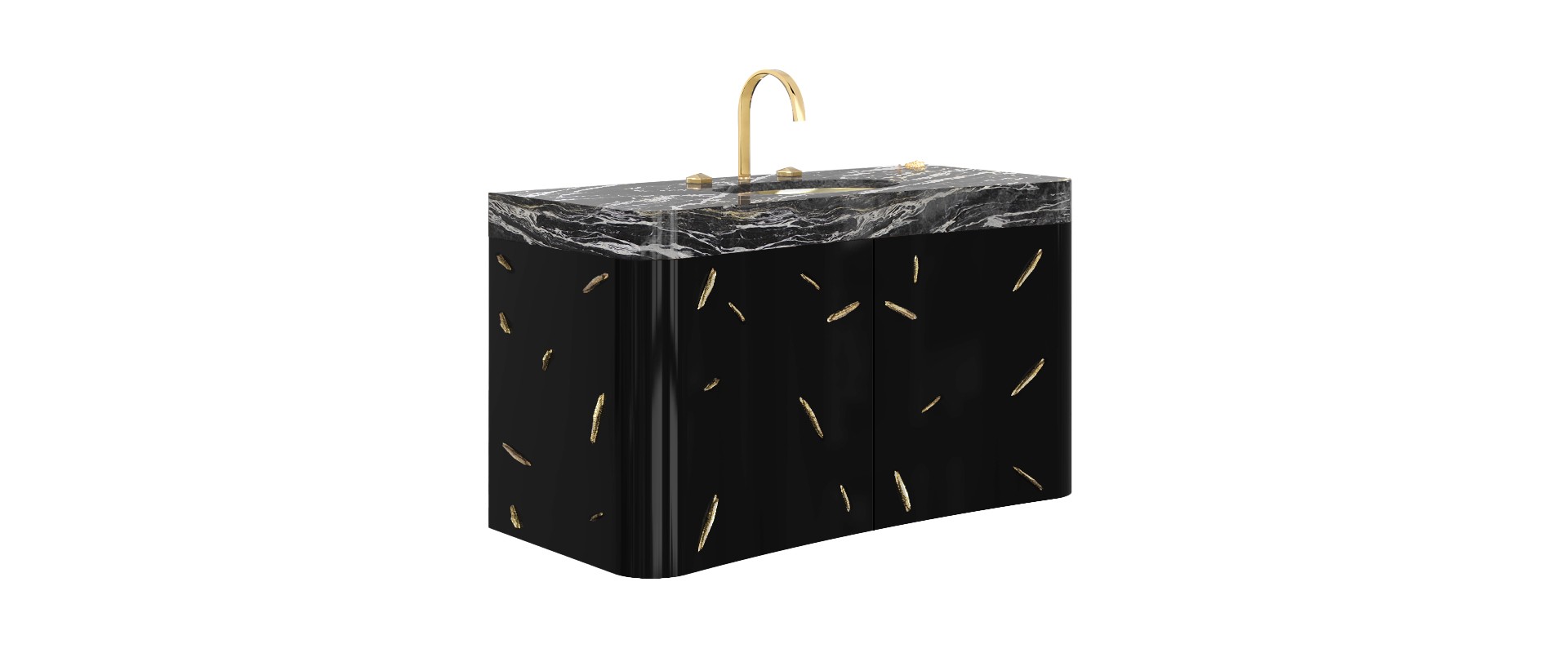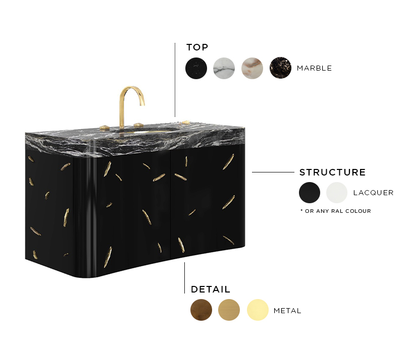 Top: Black Kenya Marble; Sink: Gold Plated Brass, High Gloss Varnish; Structure: High Gloss Black Lacquered; Details: Gold Plated Brass, High Gloss Varnish; Water drainage: Wall
