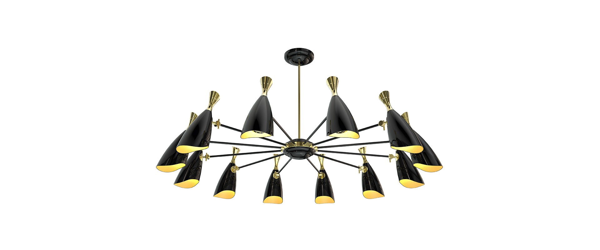 Duke is a modern pendant lighting design that boasts a heavy nostalgic 70s groove vibe. Inspired by the simplicity of the 1970s, DelightFULL’s designers were able to create an iconic modern ceiling light that suits the most demanding setting. Produced in Portugal, it is handmade in brass and aluminum. The body, made of brass, has both a matte black and a gold-plated finish, while the shades are lacquered a glossy black on the outside. The inside is matte white, but it can also have a gold powder paint finish. It is a stunning bedroom ceiling light, but this large ceiling light can also be considered for other settings, such as a mid-century modern living room.