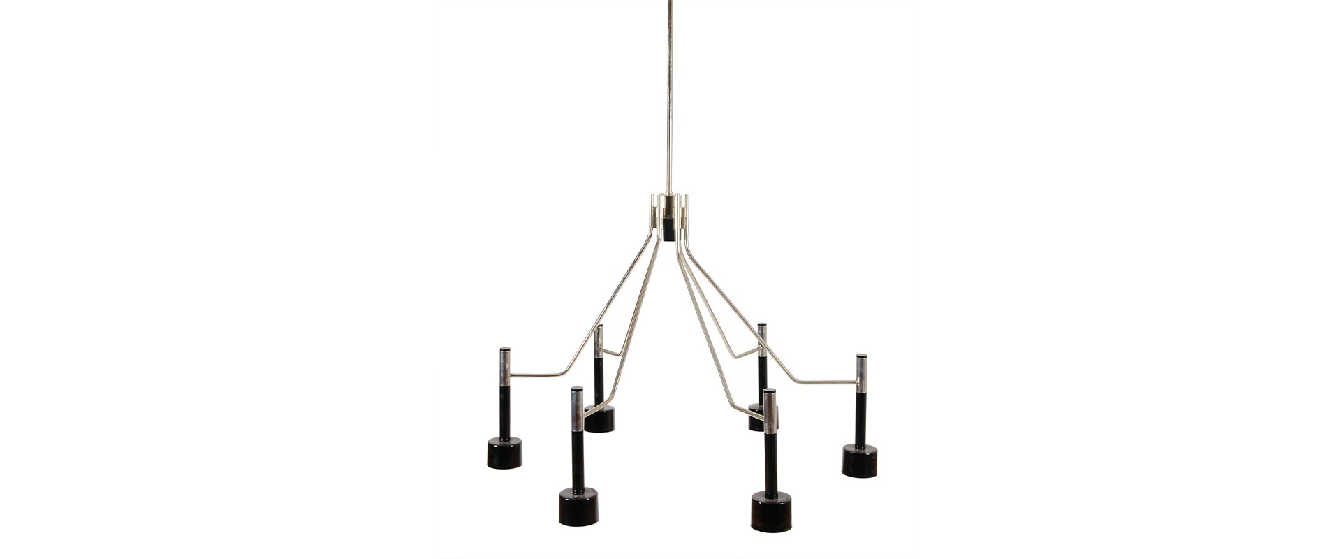 Ella round chandelier is a unique ceiling fixture which brings back the clean and sophisticated feelings of the mid-century modern era lived in the 1960’s Palm Springs. With a body 100% handmade in brass and its lampshades made of aluminum, this lighting design was reinvented using today’s technical skills paired with the traditional craftsmanship and know-how of some of the best Portuguese artisans. The body has a nickel plated finish, while the lampshades are lacquered a glossy black for a sleeker look. It is available both in the 6 or 15 arms versions. An iconic mid-century modern chandelier, perfect for a contemporary living room or dining area.