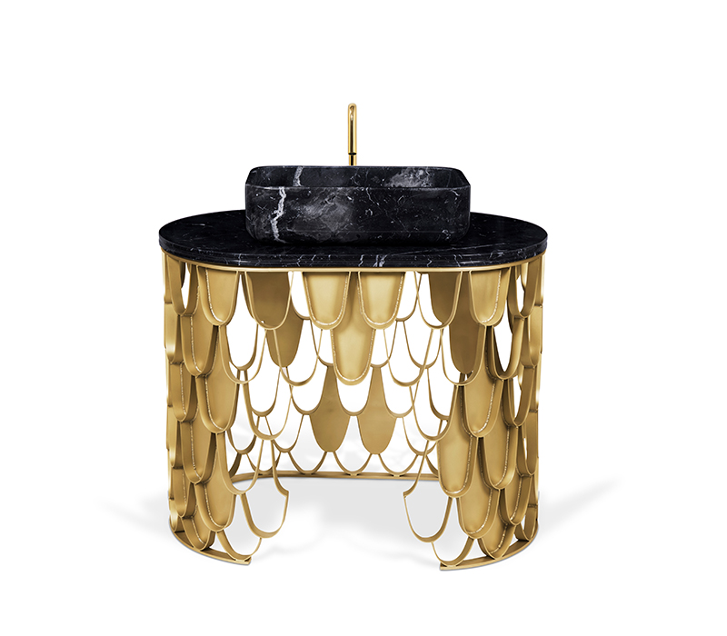 Structure: Brushed Brass Matte, Matt Varnish; Top: Nero Marquina Marble; Sink: Nero Marquina Marble; Water drainage: Wall