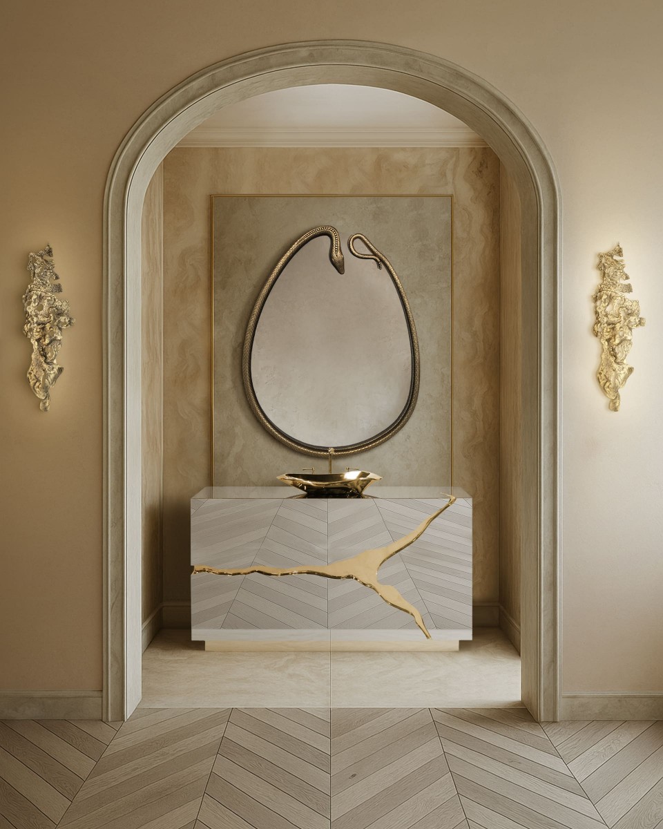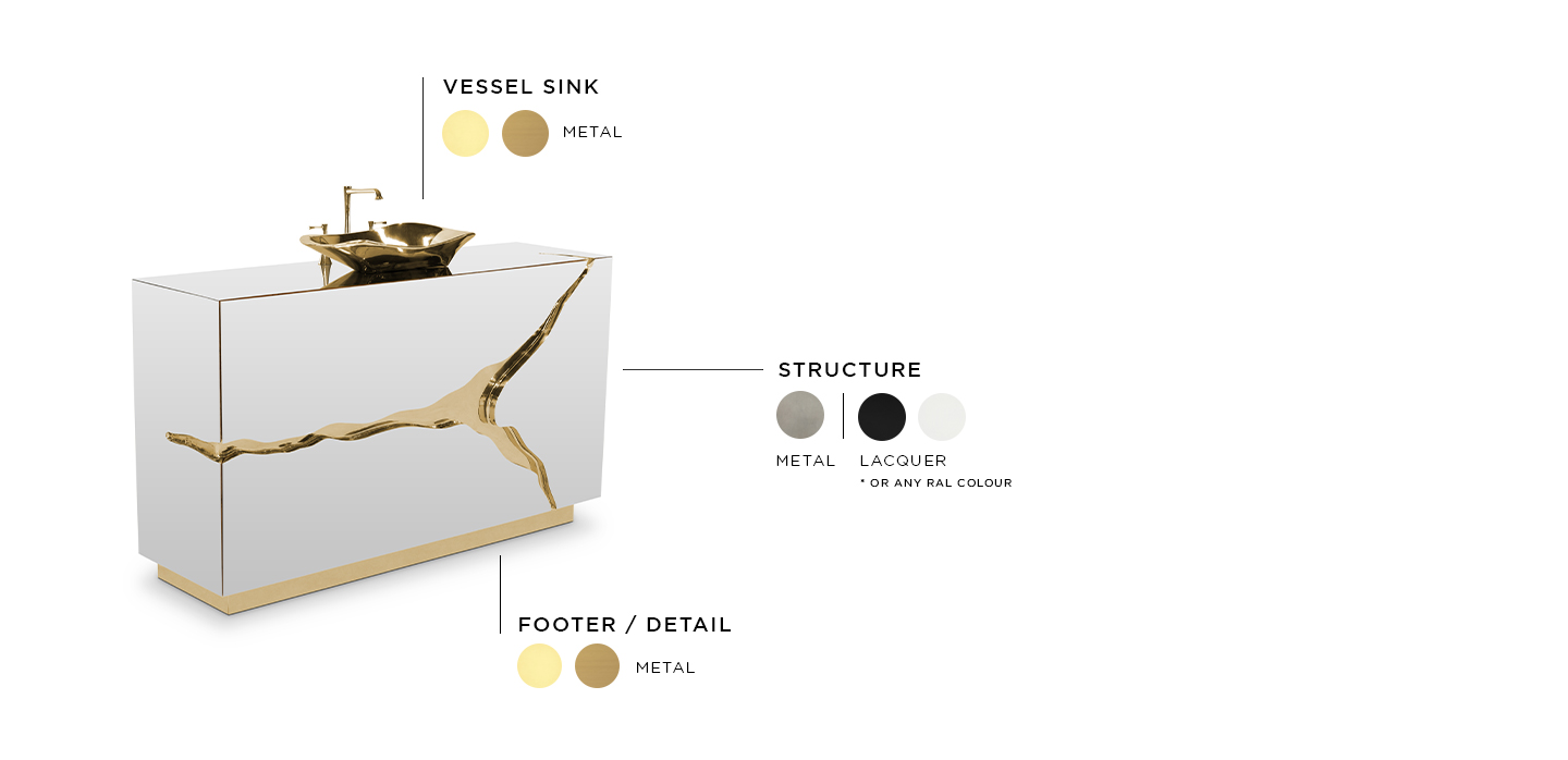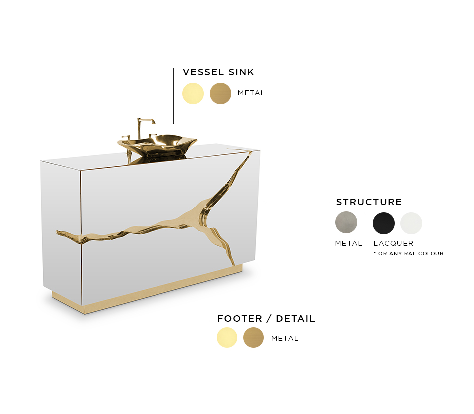 Lapiaz was inspired by the typical karst formations produced by the dissolution of limestone rocks. With a polished brass tear enhanced by its rich aesthetic as well as a set of one door and two drawers finished in poplar root veneer, this Lapiaz Single Vanity Cabinet is such a statement that stands out in your bathroom interior design.