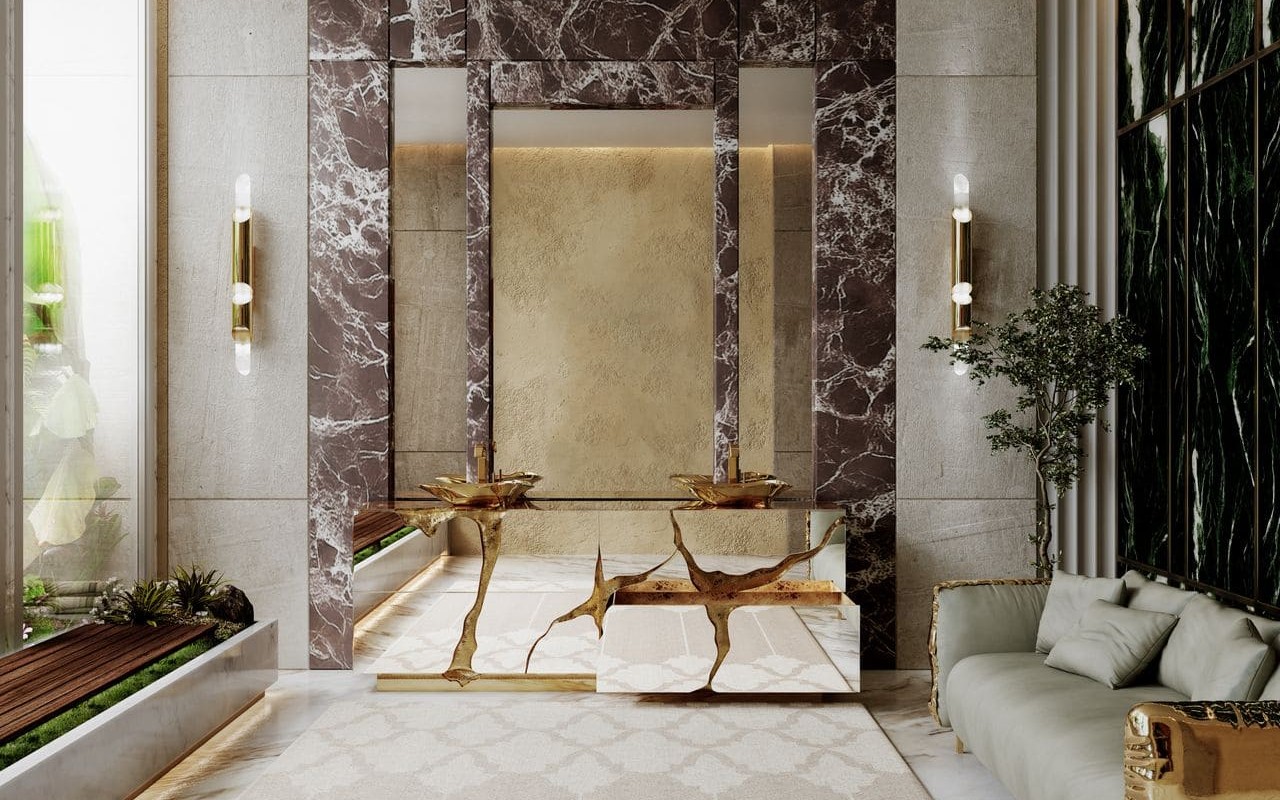Lapiaz was inspired by the typical karst formations produced by the dissolution of limestone rocks. With a polished brass tear enhanced by its rich aesthetic as well as a set of four doors finished in poplar root veneer, this Lapiaz Vanity Cabinet is such a statement that stands out in your bathroom interior design!