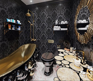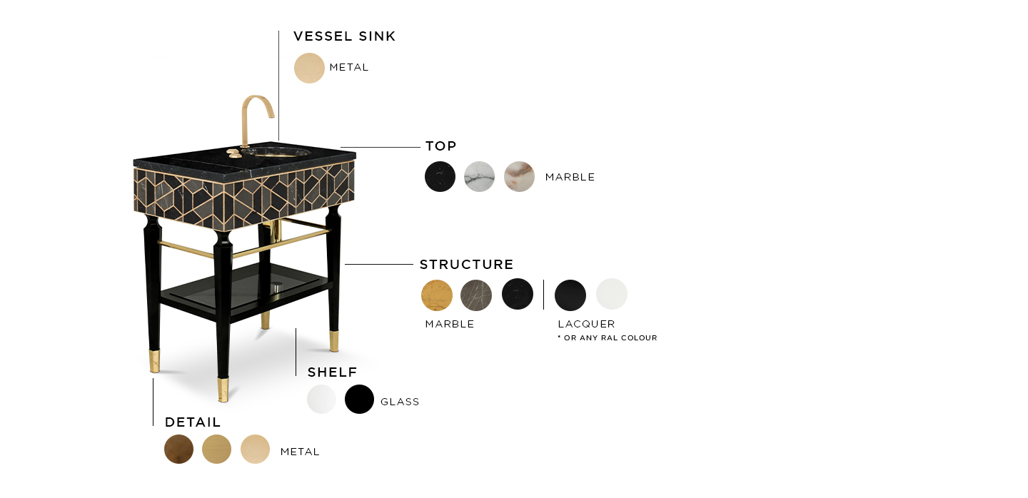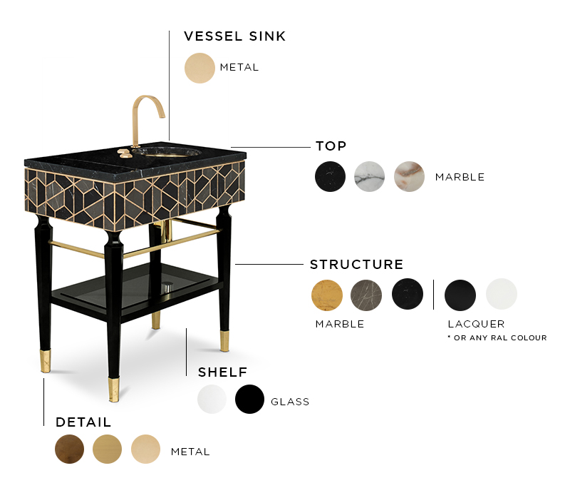 Highly appreciated for its decorative purposes for centuries, the tortoise’s hard outer shell has been the inspiration for different pieces. The reason is its beautiful patterns and colors, which make the Tortoise Single Vanity Cabinet unique. Black, grey and golden colors show a marvelous piece, contrasting with the golden tap and sink and black legs. Highly functional, it includes a mirrored shelf, a built-in drawer, a spacious Nero Marquina countertop, and gold plated tubes where you can hang the most comfortable towels. A strong combination of uniqueness and functionality to a modern bathroom.