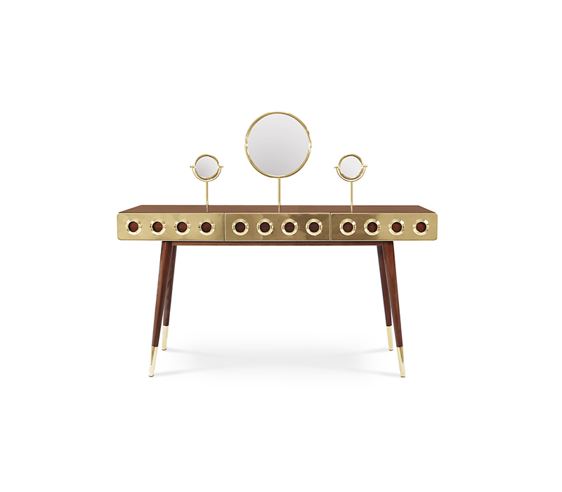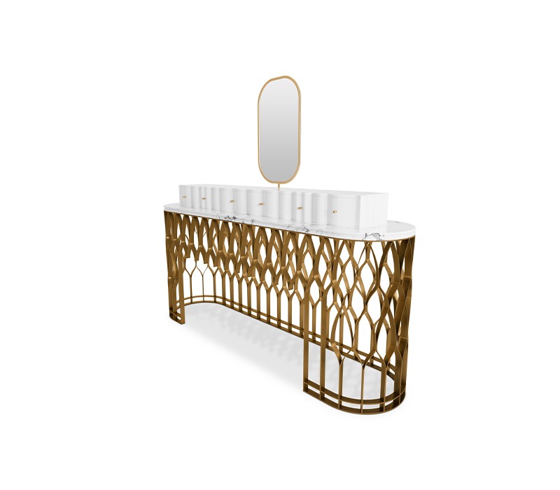 The Mecca Vanity Table is a tribute to the architectural grandeur of mosques, blending traditional elegance with modern design. Its brushed brass matte columns echo the intricate details of Islamic architecture, adding a sense of opulence and sophistication. The Carrara Marble top, with its soft gray undertones and delicate veining, creates a refined contrast that enhances the table’s luxurious appeal. Crafted with meticulous attention to detail, this vanity table is a functional piece and a statement of timeless beauty. Whether placed in a bedroom or bathroom, the Mecca Vanity Table brings an air of refinement to any space.