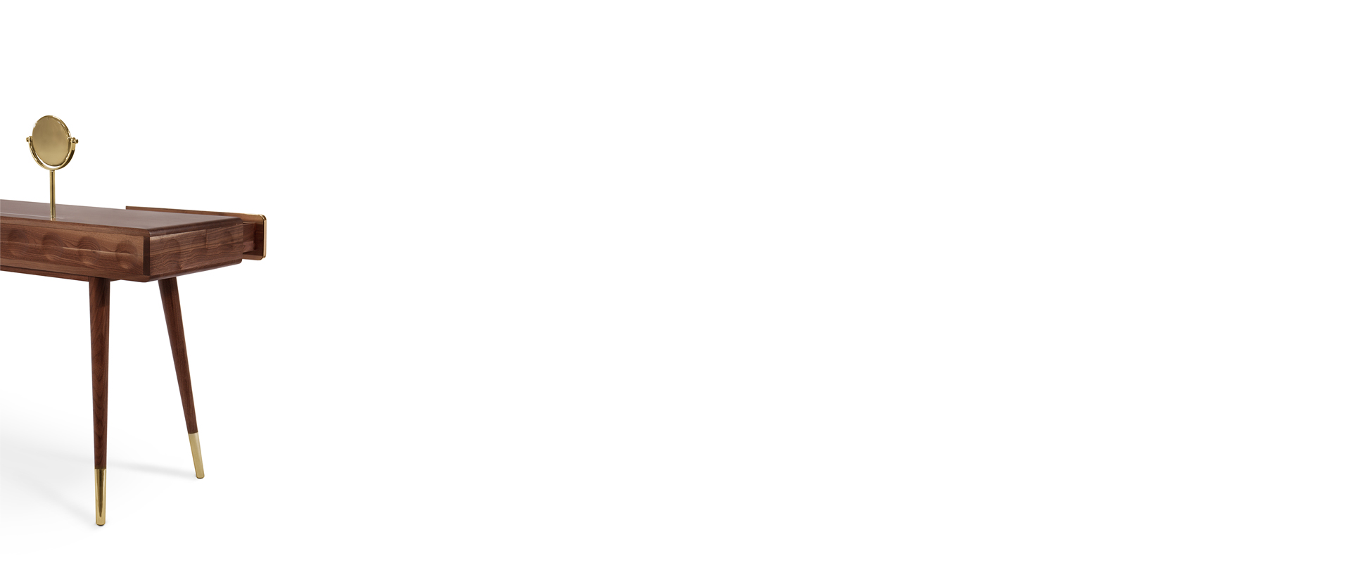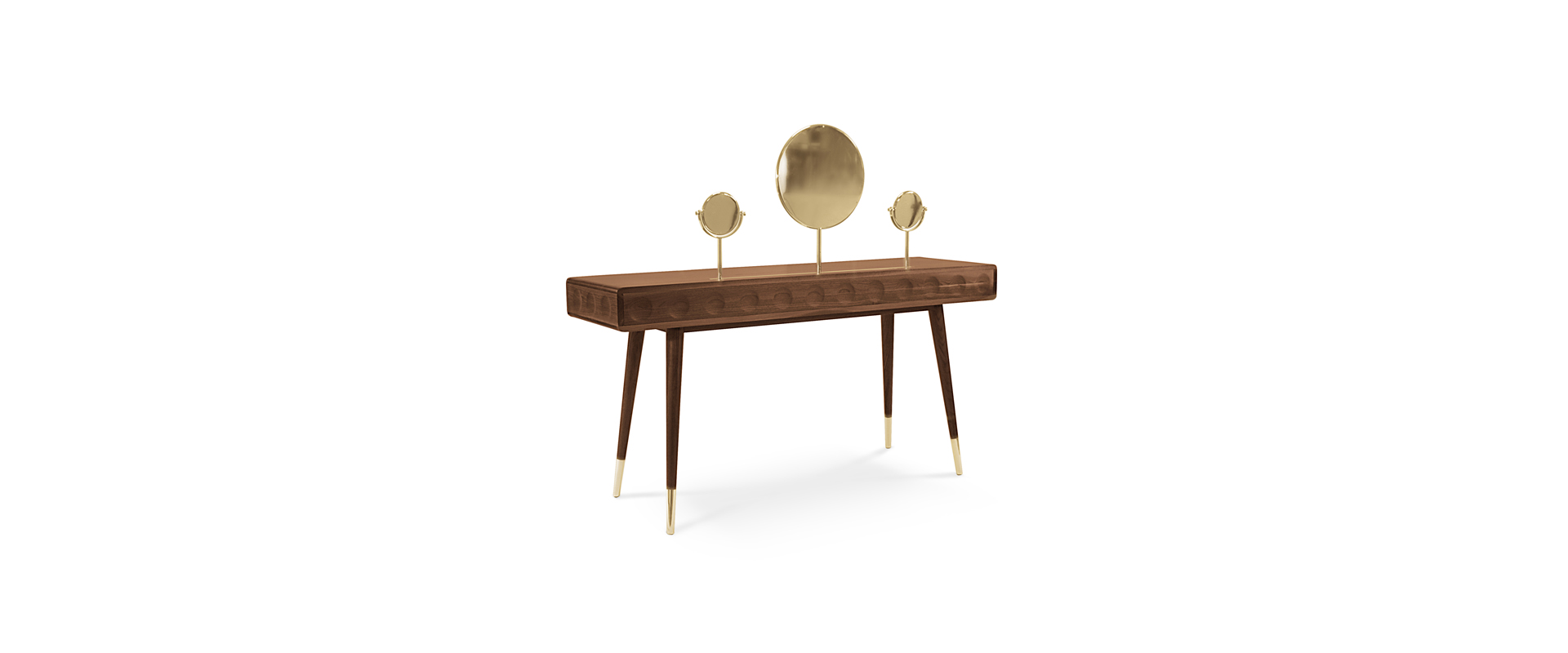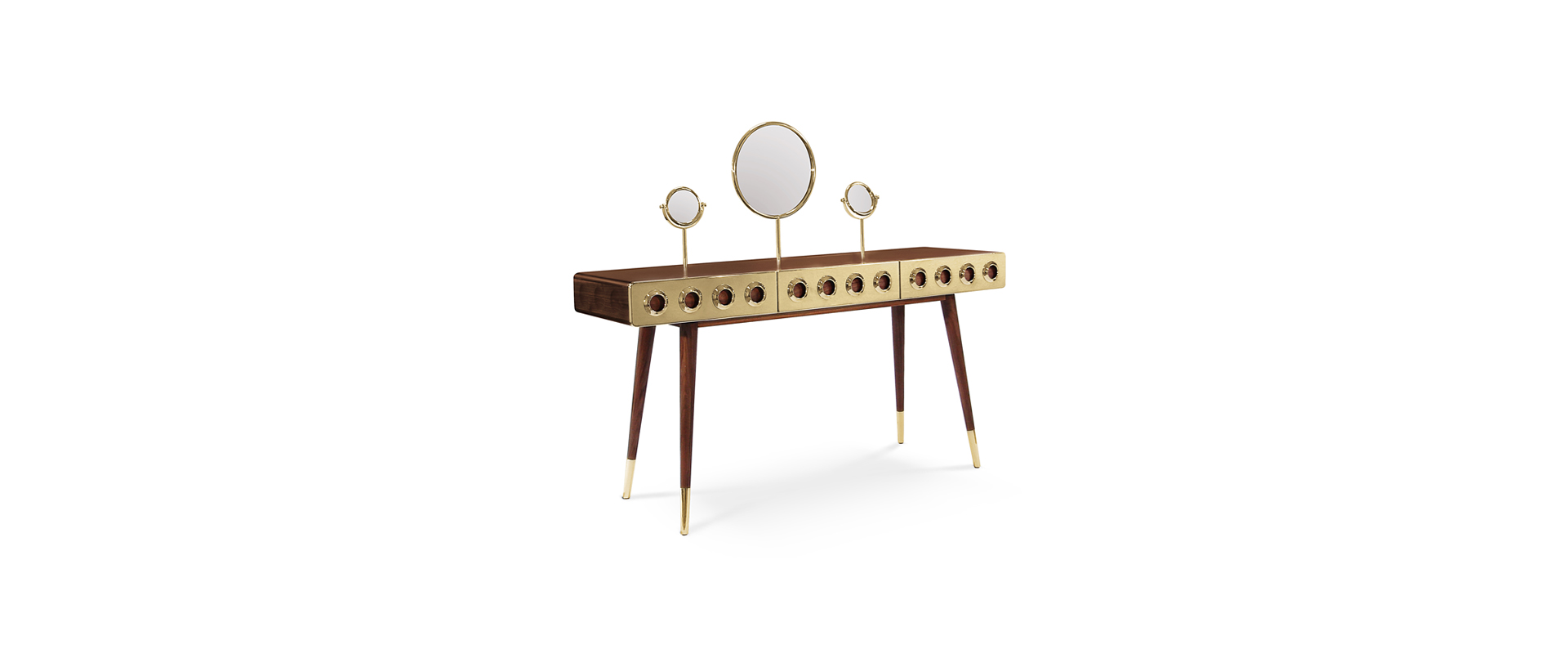 A striking addition to your glamorous boudoir, Monocles Vanity Table has a mid-century feel and is constructed of solid walnut wood and offers three front drawers produced in gold plated brass. This retro table is supported by atomic legs and features a set of 3 bullseye mirrors with a brass rim, providing flexibility and a great sense of style to your bathroom decor.