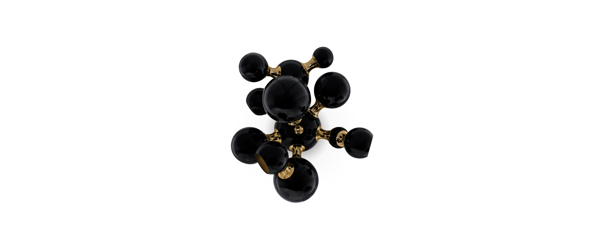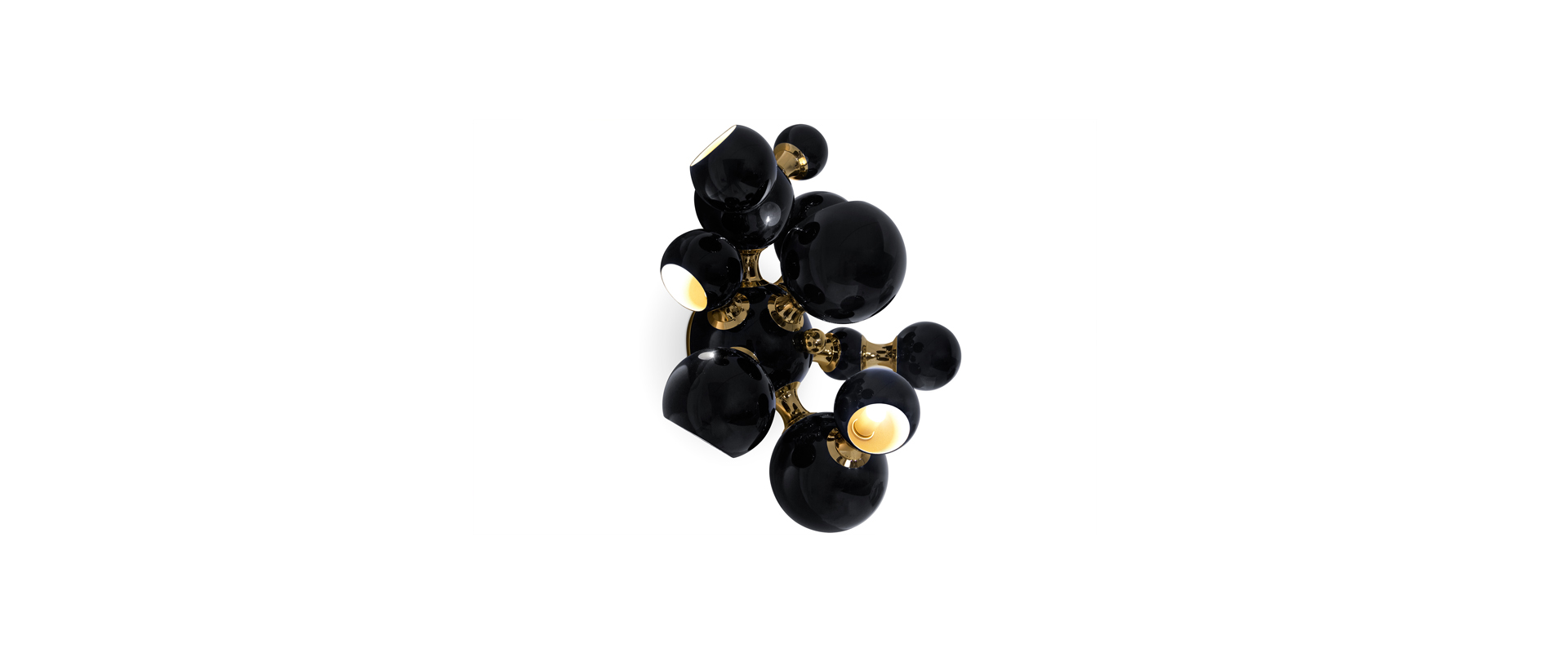 Atomic wall light is a mid-century modern lighting design inspired by the atomic discoveries of the mid-20th century. With multiple round shades that resemble the molecular composition of the atom, this interior wall light can give a fun twist to a contemporary home decor. Its body is handmade in brass and steel, with both a glossy black and a gold-plated finish. The lamp shades feature a glossy black lacquer on the exterior, while gold powder paint is used for the interior shade. It is with a modern vibe that this indoor wall light creates a statement of mid-century modern design in a contemporary living room, displaying each detail as a faithful reproduction of the glamorous 1950s.