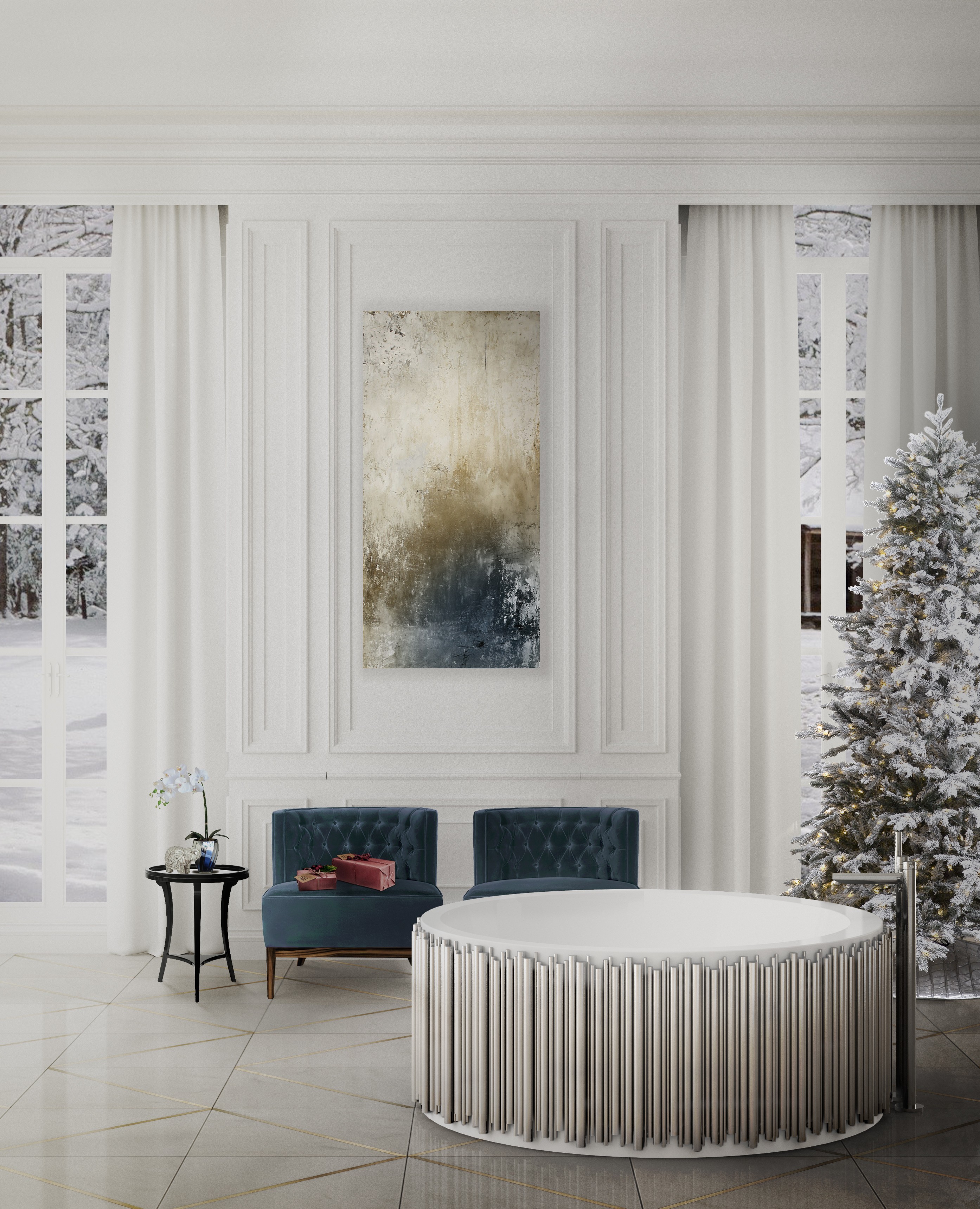 Are you looking for a sophisticated open-plan master bathroom? This master bathroom features the Oval Symphony Bathtub full of detail and textures, while their white tones add an extra layer of glamour to this set. A simpler yet luxurious bathroom is completed with a Christmas tree near the bathtub to complete the look for a cozier holiday season. Visit our ATO Collection for an extra level of customization.